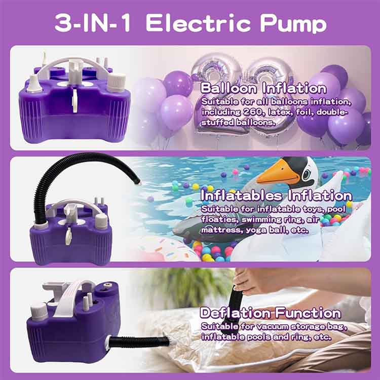 3 In 1 elektrische ballonpomp gebruiken technologie om het leven te vereenvoudigen en creativiteit binnen handbereik te maken. Of het nu gaat om een familiebijeenkomst, vakantieviering, buitenavontuur of huisopslag, het is een must-have artefact voor u om de kwaliteit van uw leven te verbeteren! Krijg het nu en begin een nieuwe ervaring van efficiënte en handige inflatie!