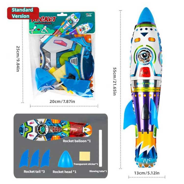 De opblaasbare 3D-raketfolie-ballonwerper is een lang, onregelmatig gevormd opblaasbaar speelgoed met raketgerelateerde patronen op het oppervlak gedrukt. De kop- en staartvinnen moeten met de hand worden gemonteerd en vervolgens worden geïnstalleerd nadat ze zijn opgeblazen. Het is gemaakt van aluminiumfolie, is niet gemakkelijk kapot en is duurzaam. Geschikt voor gebruik in feestdecoraties met een ruimtethema, maar ook als speelrekwisieten voor kinderen.