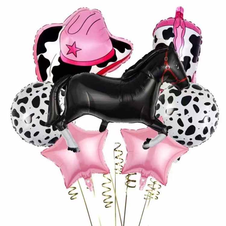 Met nauwkeurige lijncontouren en kleurafstemming herstellen ze de spiercontouren en vloeiende manen van de rennende paarden, en gebruikelijke natuurlijke kleurenschema's zoals bruin en zwart passen beter bij het echte beeld van de paarden. Sommige folieballonnen met cowboythema voegen zelfs metallic kleuren toe, zoals zilver en goud, om de visuele impact te vergroten; het koeienpatroon is rond, met zwart-witte koepatronen erop gedrukt, en sommige stijlen voegen enkele driedimensionale versieringen toe, zoals kleine belletjes en plustaarten onder de aluminiumfolieballonnen, die zowel schattig zijn als een landelijke stijl hebben, en een zeer populair thema zijn voor cowboyactiviteiten voor gezinnen.