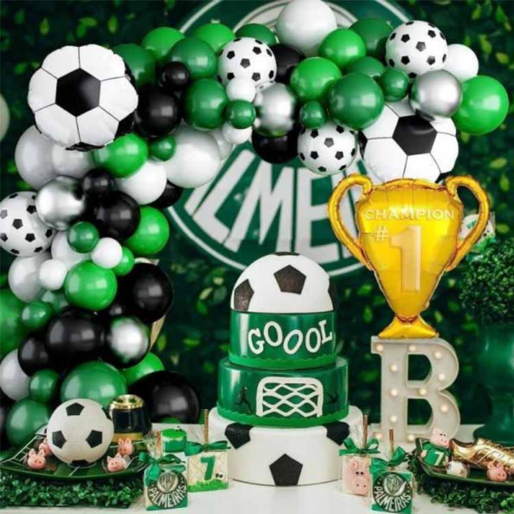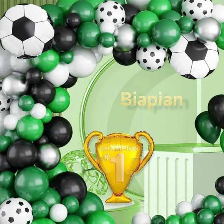 De ballonboogsets met voetbalthema bevatten groene, zwarte en witte ballonnen als hoofdcomponenten, terwijl voetbalvormige ballonnen als versieringen zijn toegevoegd om een decoratieve achtergrond met een duidelijk thema te creëren. Dit product is speciaal ontworpen voor voetbalevenementen, feesten met voetbalthema, activiteiten van voetbalclubs, enz., waardoor een levendige sfeer ontstaat en meer mensen worden geïnspireerd om van voetbalactiviteiten te houden.
