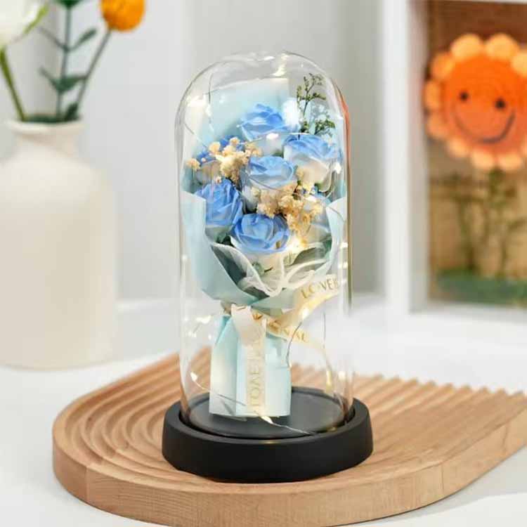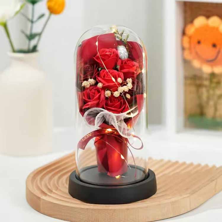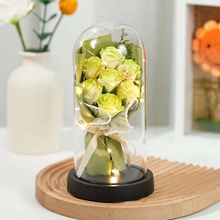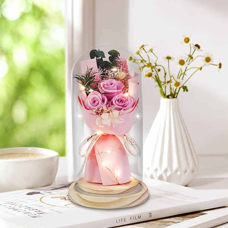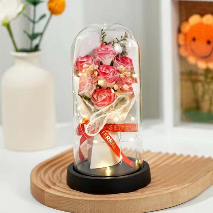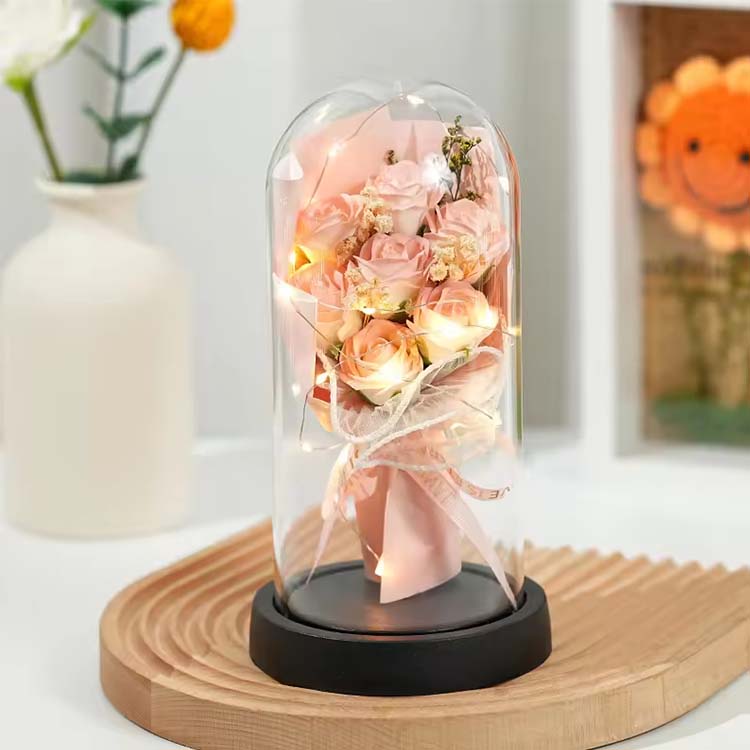 Ons zeep-rozenboeket met glazen koepel en LED-geschenkdoos combineert praktische functionaliteit met sentimentele betekenis, waardoor het een geschenk is dat de moeite waard is om te koesteren. Of je nu een vleugje romantiek aan je huis toevoegt of een speciaal cadeau naar een speciaal iemand stuurt, het is een warm en onvergetelijk cadeau.