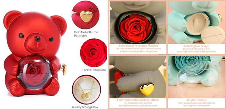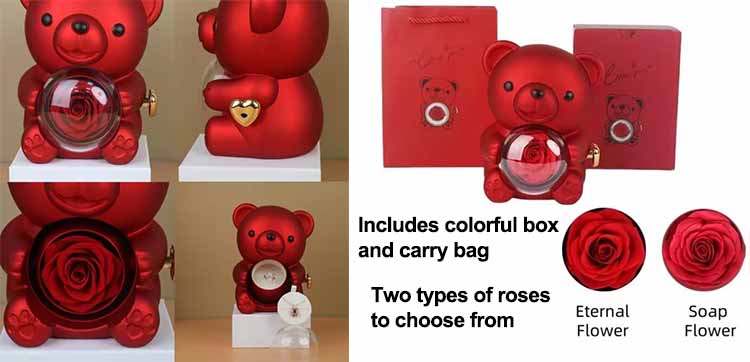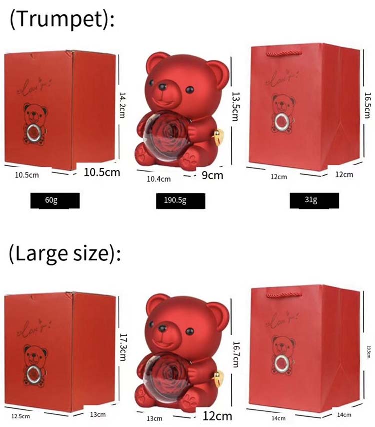 De geconserveerde bloemenverrassingsknuffelbeer is verkrijgbaar in twee maten: groot en klein. U kunt de gewenste maat kiezen op basis van uw behoeften! Eén ding om op te merken is dat de ketting en de ring op de foto rekwisieten zijn voor de fotoshoot. De twee maten hebben hun eigen kenmerken, waardoor elke emotie de juiste manier kan vinden om deze te dragen.