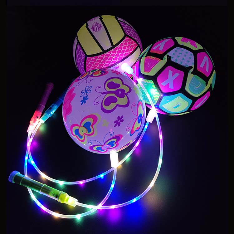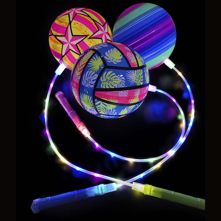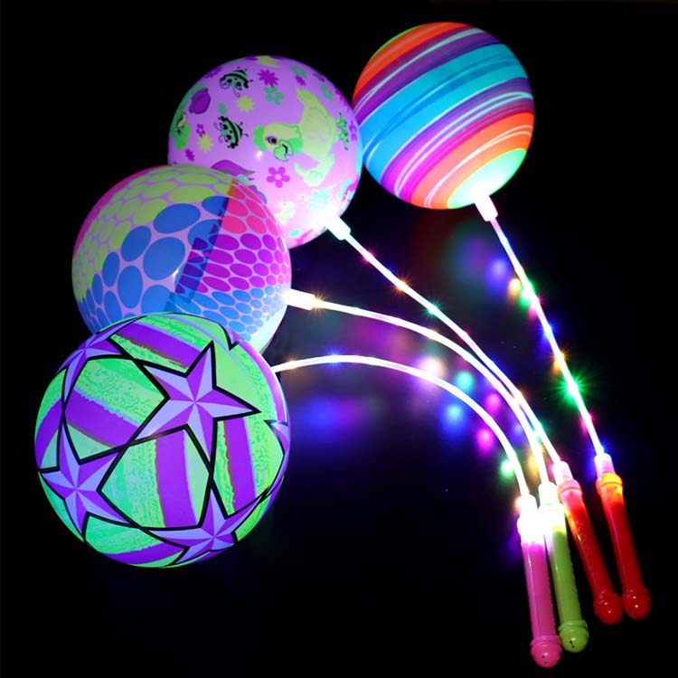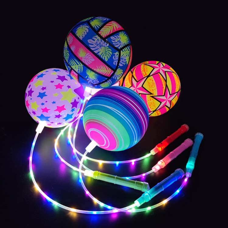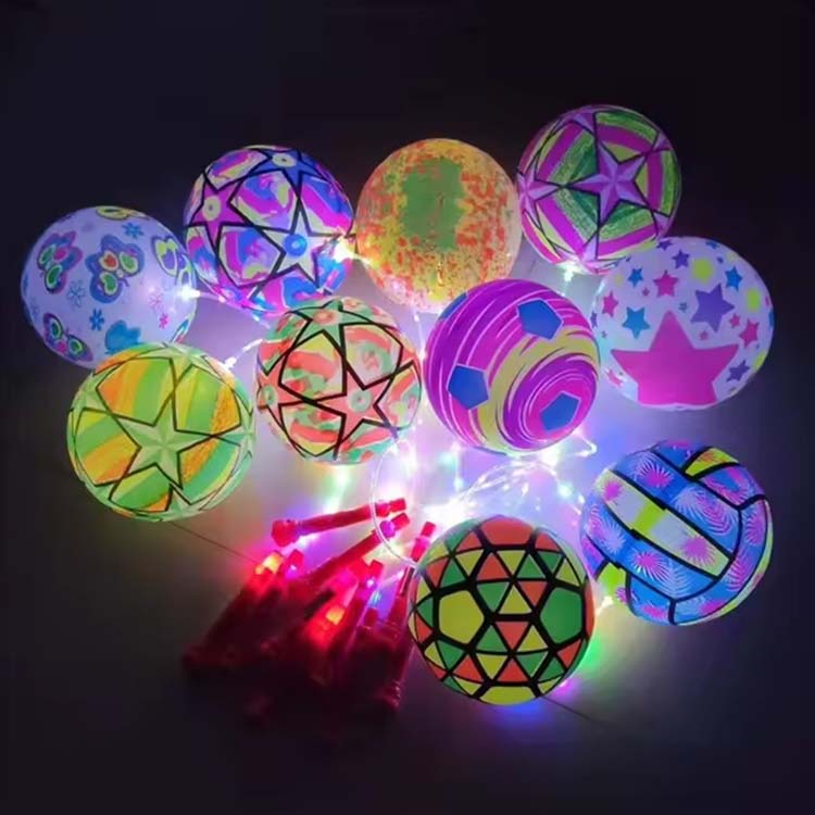 String Bouncy -ballen met LED -lichten zijn bouncy -bal vastgebonden aan touw, met LED -lichten ingebed binnen of op het oppervlak. Wanneer ze worden omgedraaid, stoten de LED's kleurrijke lichten uit wanneer je stuitert, zwaait of vasthoudt. Deze lichten zijn beter zichtbaar in donkere omgevingen.